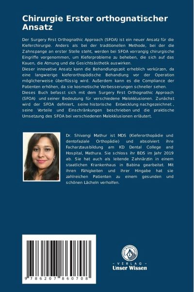 Der Surgery First Orthognathic Approach (SFOA) ist ein neuer Ansatz für die Kieferchirurgie. Anders als bei der traditionellen Methode, bei der die Zahnspange an erster Stelle steht, werden bei SFOA vorrangig chirurgische Eingriffe vorgenommen, um Kieferprobleme zu beheben, die sich auf das Kauen, die Atmung und die Gesichtsästhetik auswirken.Dieser innovative Ansatz kann die Behandlungszeit erheblich verkürzen, da eine langwierige kieferorthopädische Behandlung vor der Operation möglicherweise überflüssig wird. Außerdem kann es die Compliance der Patienten erhöhen, da sie kosmetische Verbesserungen schneller sehen.Dieses Buch befasst sich mit dem Surgery First Orthognathic Approach (SFOA) und seiner Bedeutung für verschiedene Malokklusionen. Zunächst wird der SFOA definiert, seine historische Entwicklung nachgezeichnet , seine Vorteile und Einschränkungen beschrieben und die praktische Umsetzung des SFOA bei verschiedenen Malokklusionen erläutert.