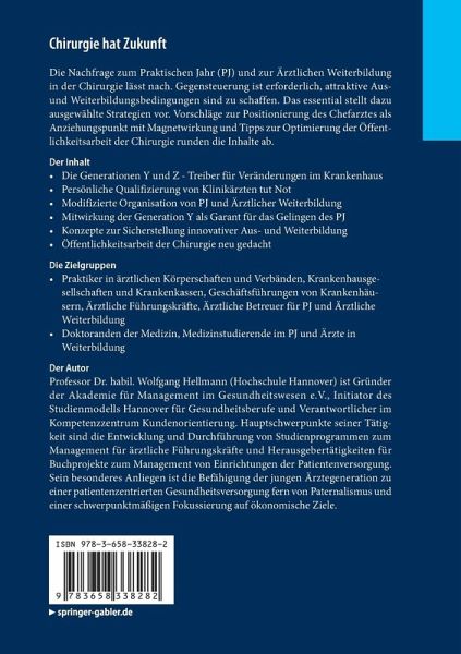 Die Nachfrage zum Praktischen Jahr (PJ) und zur Ärztlichen Weiterbildung in der Chirurgie lässt nach. Gegensteuerung ist erforderlich, attraktive Aus- und Weiterbildungsbedingungen sind zu schaffen. Das essential stellt dazu ausgewählte Strategien vor. Vorschläge zur Positionierung des Chefarztes als Anziehungspunkt mit Magnetwirkung und Tipps zur Optimierung der Öffentlichkeitsarbeit der Chirurgie runden die Inhalte ab.