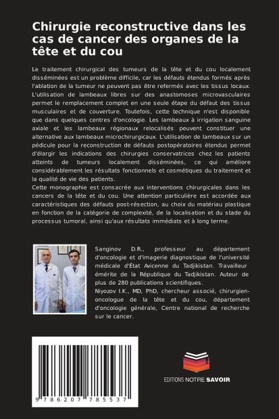 Le traitement chirurgical des tumeurs de la tête et du cou localement disséminées est un problème difficile, car les défauts étendus formés après l'ablation de la tumeur ne peuvent pas être refermés avec les tissus locaux. L'utilisation de lambeaux libres sur des anastomoses microvasculaires permet le remplacement complet en une seule étape du défaut des tissus musculaires et de couverture. Toutefois, cette technique n'est disponible que dans quelques centres d'oncologie. Les lambeaux à irrigation sanguine axiale et les lambeaux régionaux relocalisés peuvent constituer une alternative aux lambeaux microchirurgicaux. L'utilisation de lambeaux sur un pédicule pour la reconstruction de défauts postopératoires étendus permet d'élargir les indications des chirurgies conservatrices chez les patients atteints de tumeurs localement disséminées, ce qui améliore considérablement les résultats fonctionnels et cosmétiques du traitement et la qualité de vie des patients.Cette monographie est consacrée aux interventions chirurgicales dans les cancers de la tête et du cou. Une attention particulière est accordée aux caractéristiques des défauts post-résection, au choix du matériau plastique en fonction de la catégorie de complexité, de la localisation et du stade du processus tumoral, ainsi qu'aux résultats immédiats et à long terme.
