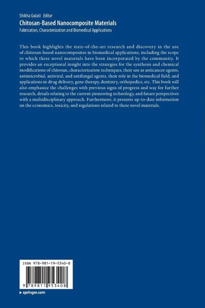 Chapter 1. Introduction to chitosan and chitosan-based nanocomposites.- Chapter 2. Strategies for the synthesis and chemical modifications of chitosan.- Chapter 3. Characterization Techniques for Chitosan and its Based nanocomposites.- Chapter 4. Application of Chitosan Based nanocomposites for Drug Delivery.- Chapter 5. Application of Chitosan Based nanocomposites in Gene Therapy.- Chapter 6. Application of Chitosan Based nanocomposites in Tissue Engineering and regenerative medicine.- Chapter 7. Application of Chitosan-Based nanocomposites in Cancer Diagnosis and treatment.- Chapter 8. Application of Chitosan-Based nanocomposites in Bioimaging.- Chapter 9. Application of Chitosan-Based nanocomposites as wound healing agents.- Chapter 10. Application of Chitosan-Based nanocomposites as antibacterial agents.- Chapter 11. Application of Chitosan-Based nanocomposites as antifungal agents.- Chapter 12. Application of Chitosan-Based nanocomposites as antiviral agents.- Chapter 13. Application of Chitosan-Based nanocomposites in orthopedics and dentistry.- Chapter 14. Conclusion and future prospects.