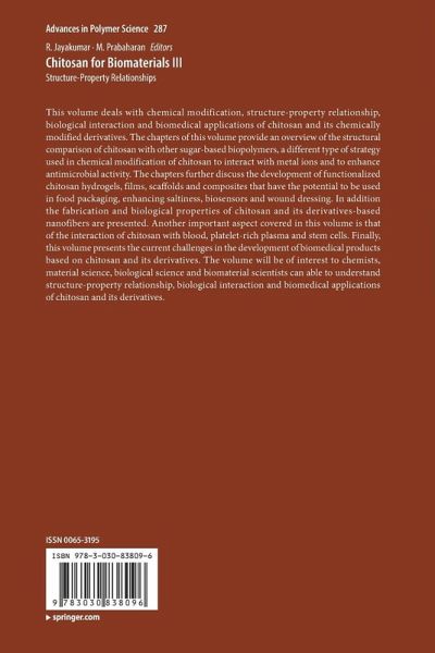 Perspectives and Challenges of Using Chitosan in the Biomedical Field.- Review of the Structure of Chitosan In the Context of Other Sugar-Based Polymers.- Synthesis & Modification Strategies of Chitosan and Its interaction with metal ions.- Synthesis-structure Relationships of Chitosan Based Hydrogels.- Antimicrobial Properties of Chitosan and Its Derivatives.- Chitin and Chitosan in Saltiness Enhancer.- Modified Chitosan Films/Coatings for Active Food Packaging.- Fabrication and Structural Studies on Chitosan Enabled Biosensors.- Physical and Chemical Modification of Chitin/Chitosan For Functional Wound Dressing.- Preparation of Chitosan and its Derivatives Based Nanofibers and Their Efficient Biological Properties.- Chitosan-Blood and Platelet-Rich Plasma Interactions.- Chitosan-Stem Cell Interactions.