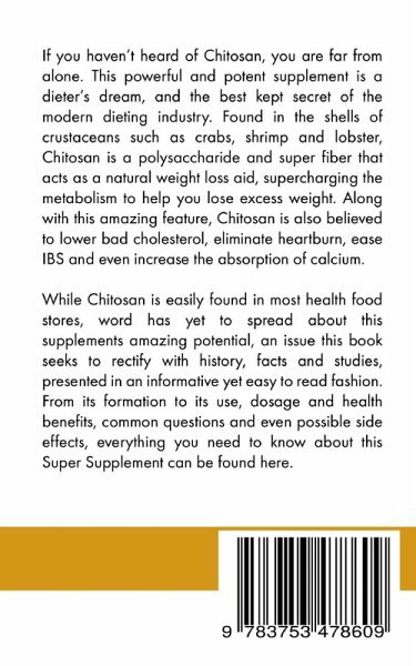 If you haven't heard of Chitosan, you are far from alone. This powerful and potent supplement is a dieter's dream, and the best kept secret of the modern dieting industry. Found in the shells of crustaceans such as crabs, shrimp and lobster, Chitosan is a polysaccharide and super fiber that acts as a natural weight loss aid, supercharging the metabolism to help you lose excess weight. Along with this amazing feature, Chitosan is also believed to lower bad cholesterol, eliminate heartburn, ease IBS and even increase the absorption of calcium. While Chitosan is easily found in most health food stores, word has yet to spread about this supplements amazing potential, an issue this book seeks to rectify with history, facts and studies, presented in an informative yet easy to read fashion. From its formation to its use, dosage and health benefits, common questions and even possible side effects, everything you need to know about this Super Supplement can be found here.