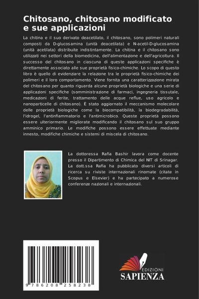 La chitina e il suo derivato deacetilato, il chitosano, sono polimeri naturali composti da D-glucosamina (unità deacetilata) e N-acetil-D-glucosamina (unità acetilata) distribuite indistintamente. La chitina e il chitosano sono utilizzati nei settori della biomedicina, dell'alimentazione e dell'agricoltura. Il successo del chitosano in ciascuna di queste applicazioni specifiche è direttamente associato alle sue proprietà fisico-chimiche. Lo scopo di questo libro è quello di evidenziare la relazione tra le proprietà fisico-chimiche dei polimeri e il loro comportamento. Viene fornita una caratterizzazione mirata del chitosano per quanto riguarda alcune proprietà biologiche e una serie di applicazioni specifiche (somministrazione di farmaci, ingegneria tissutale, medicazioni di ferite, trattamento delle acque reflue, uso agricolo e nanoparticelle di chitosano). È stato aggiornato il meccanismo molecolare delle proprietà biologiche come la biocompatibilità, la biodegradabilità, l'idrogel, l'antinfiammatorio e l'antimicrobico. Queste proprietà possono essere ulteriormente migliorate modificando il chitosano sul suo gruppo amminico primario. Le modifiche possono essere effettuate mediante innesto, modifiche chimiche e sistemi di miscela di chitosano.