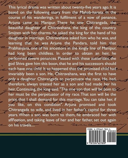 This lyrical drama was written about twenty-five years ago. It is based on the following story from the Mahab-harata. In the course of his wanderings, in fulfilment of a vow of penance, Arjuna came to Manipur. There he saw Chitrangada, the beautiful daughter of Chitravahana, the king of the country. Smijten with her charms, he asked the king for the hand of his daughter in marriage. Chitravahana asked him who he was, and learning that he was Arjuna the Pandara, told him that Prabhanjana, one of his ancestors in the kingly line of Manipur, had long been childless. In order to obtain an heir, he performed severe penances. Pleased with these austerities, the god Shiva gave him this boon, that he and his successors should each have one child. It so happened that the promised child had invariably been a son. He, Chitravahana, was the first to have only a daughter Chitrangada to perpetuate the race. He. had, therefore, always treated her as a son and had made her his heir. Continuing, the king said: "The one son that will be bom to her must be the perpetuator of my race. That son will be the price that I shall demand for this marriage. You can take her, if you like, on this condition". Arjuna promised and took Chitrangada to wife, and lived in her father's capital for three years. When a son was born to them, he embraced her with aflFeetion, and taking leave of her and her father, set out again on his travels.