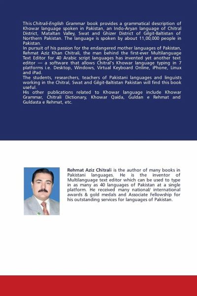 This Chitrali-English Grammar book provides a grammatical description of Khowar language spoken in Pakistan, an Indo-Aryan language of Chitral District, Mataltan Valley, Swat and Ghizer District of Gilgit-Baltistan of Northern Pakistan. The language is spoken by about 11,00,000 people in Pakistan.In pursuit of his passion for the endangered mother languages of Pakistan, Rehmat Aziz Khan Chitrali, the man behind the first-ever Multilanguage Text Editor for 40 Arabic script languages has invented yet another text editor - a software that allows Chitral's Khowar language typing in 7 platforms i.e. Desktop, Windows, Virtual Keyboard Online, iPhone, Linux and iPad.The students, researchers, teachers of Pakistani languages and linguists working in the Chitral, Swat and Gilgit-Baltistan Pakistan will find this book useful.His other publications related to Khowar language include Khowar Grammar, Chitrali Dictionary, Khowar Qaida, Guldan e Rehmat and Guldasta e Rehmat, etc.