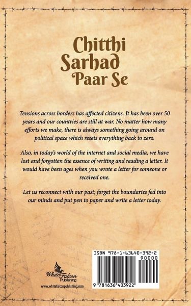 #WriteforPeace-The Literary Manifesto Chitthi Sarhad Paar Se Tensions across borders has affected citizens. It has been over 50 years and our countries are still at war. No matter how many efforts, we make there is always something going around on political space which resets everything back to zero. Also, in today's world of the internet and social media, we have lost and forgotten the essence of writing and reading a letter. It would have been ages when you wrote a letter for someone or received one. Let us reconnect with our past; forget the boundaries fed into our minds and put pen to paper and write a letter today. White Falcon Publishing, India in collaboration with Daastan, Pakistan invited entries in the form of letters to anyone across the border under the campaign - Chitthi Sarhad Paar Se. The best letters were shortlisted that form part of this book. We thank all the contributors who whole-heartedly wrote letters for someone across the border.