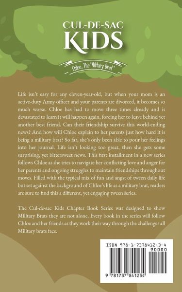 Life isn't easy for any eleven-year-old, but when your mom is an active-duty Army officer and your parents are divorced, it becomes so much worse. Chloe has had to move three times already and is devastated to learn it will happen again, forcing her to leave behind yet another best friend. Can their friendship survive this world-ending news? And how will Chloe explain to her parents just how hard it is being a military brat? So far, she's only been able to pour her feelings into her journal. Life isn't looking too great, then she gets some surprising, yet bittersweet news. This first installment in a new series follows Chloe as she tries to navigate her conflicting love and anger for her parents and ongoing struggles to maintain friendships throughout moves. Filled with the typical mix of fun and angst of tween daily life but set against the background of Chloe's life as a military brat, readers are sure to find this a different, yet engaging tween series. The Cul-de-sac Kids Chapter Book Series was designed to show Military Brats they are not alone. Every book in the series will follow Chloe and her friends as they work their way through the challenges all Military brats face.