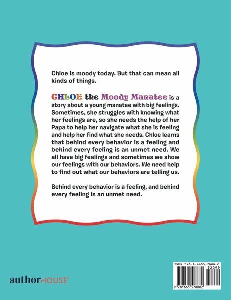 Chloe the Moody Manatee is a story about a young manatee with big feelings. Sometimes, she struggles with knowing what her feelings are, so she needs the help of her Papa to help her navigate what she is feeling and solve what she needs. Chloe learns that behind every behavior is a feeling and behind every feeling is an unmet need.
