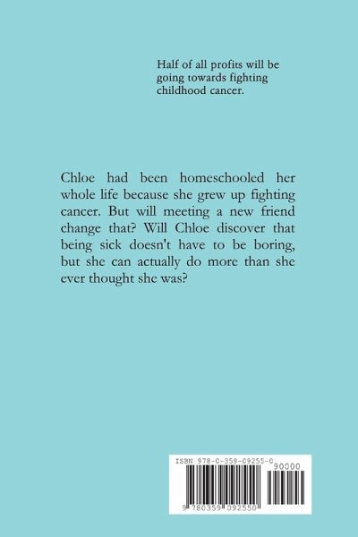 Chloe has always been home schooled through her whole life because of her fight with cancer. When she meets a new friend just like her will all that change? Will Chloe discover that having cancer doesn't mean you can't do what you want to do, but that with cancer you can actually still have a fulfilling childhood. She'll soon discover that being sick isn't all that boring.