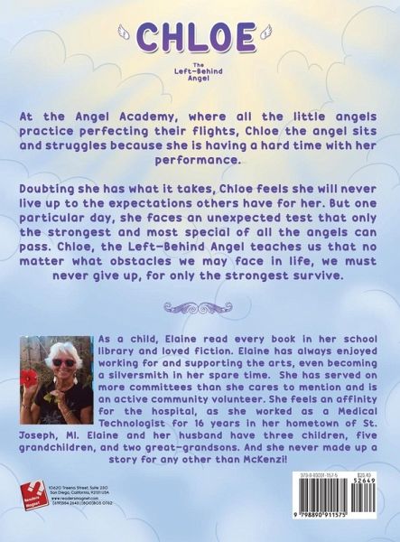 At the Angel Academy, where all the little angels practice perfecting their flights, Chloe the angel sits and struggles because she is having a hard time with her performance. Doubting she has what it takes, Chloe feels she will never live up to the expectations others have for her. But one particular day, she faces an unexpected test that only the strongest and most special of all the angels can pass. Chloe, the Left-Behind Angel teaches us that no matter what obstacles we may face in life, we must never give up, for only the strongest survive.