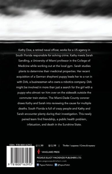 Kathy Doe, a retired naval officer, works for a US agency in South Florida responsible for solving crime. Kathy meets Sarah Sandling, a University of Miami professor in the College of Medicine while working out at the local gym. Sarah studies plants to determine their medicinal properties. Her recent acquisition of a German shepherd puppy leads her to a run in with Dirk, a businessman who owns a robotics company. Dirk might be involved in more than just a search for the girl with a puppy who almost ran him over on the sidewalk outside the commuter train station. The Miami-Dade County coroner draws Kathy and Sarah into reviewing the cause for multiple deaths. South Florida is full of crazy people and Kathy and Sarah encounter plenty during their investigation. This newly paired team find friendship, a public health problem, infatuation, and death in the Sunshine State.