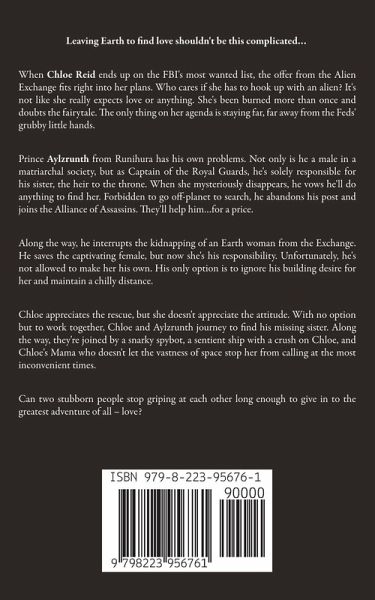 Leaving Earth to find love shouldn't be this complicated… When Chloe Reid ends up on the FBI's most wanted list, the offer from the Alien Exchange fits right into her plans. Who cares if she has to hook up with an alien? It's not like she really expects love or anything. She's been burned more than once and doubts the fairytale. The only thing on her agenda is staying far, far away from the Feds' grubby little hands. Prince Aylzrunth from Runihura has his own problems. Not only is he a male in a matriarchal society, but as Captain of the Royal Guards, he's solely responsible for his sister, the heir to the throne. When she mysteriously disappears, he vows he'll do anything to find her. Forbidden to go off-planet to search, he abandons his post and joins the Alliance of Assassins. They'll help him…for a price. Along the way, he interrupts the kidnapping of an Earth woman from the Exchange. He saves the captivating female, but now she's his responsibility. Unfortunately, he's not allowed to make her his own. His only option is to ignore his building desire for her and maintain a chilly distance. Chloe appreciates the rescue, but she doesn't appreciate the attitude. With no option but to work together, Chloe and Aylzrunth journey to find his missing sister. Along the way, they're joined by a snarky spybot, a sentient ship with a crush on Chloe, and Chloe's Mama who doesn't let the vastness of space stop her from calling at the most inconvenient times. Can two stubborn people stop griping at each other long enough to give in to the greatest adventure of all – love?