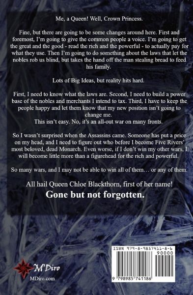 Blackthorn Part Three, Chloe's Wars. Me, a Queen! Well, Crown Princess. Fine, but there are going to be some changes around here. First and foremost, I'm going to give the common people a voice. I'm going to get the great and the good - read the rich and the powerful - to actually pay for what they use. Then I'm going to do something about the laws that let the nobles rob us blind, but takes the hand off the man stealing bread to feed his family. Lots of Big Ideas, but reality hits hard. First, I need to know what the laws are. Second, I need to build a power base of the nobles and merchants I intend to tax. Third, I have to keep the people happy and let them know that my new position isn't going to change me. This isn't easy. No, it's an all-out war on many fronts. So I wasn't surprised when the Assassins came. Someone has put a price on my head, and I need to figure out who before I become Five Rivers' most beloved, dead Monarch. Even worse, if I don't win my other wars, I will become little more than a figurehead for the rich and powerful. So many wars, and I may not be able to win all of them... or any of them. All hail Queen Chloe Blackthorn, first of her name! Gone but not forgotten!