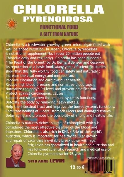 Chlorella is a freshwater-growing green micro algae filled with well balanced nutrition. In Japan, Chlorella pyrenoidosa is nutritional supplement No.1 (over 20 million people eat Chlorella daily and regularly). Chlorella has been dubbed : "The Pearl of the Orient" by Dr. Bernard Jensen and deserves its reputation as a basic food. Many years of scientific studies show that this fully worthy food can safely and naturally : Increase the vital energy and metabolism. Improve circulation and cardiovascular health. Reduce high blood pressure and normalize blood sugar. Normalize the body's PH level and prevent acidification. Protect against carcinogenic causes. Support and strengthen the immune system's functions. Detoxify the body by removing heavy metals. Help the intestinal tract and improve the bowel system's functions. Facilitate healing of ulcers, stomach ulcers and damaged tissues. Delay aging and promote the possibility of a long and healthy life. Chlorella is nature's richest source of chlorophyll which is considered the most effective cleanser of the blood and intestines. Chlorella is also rich in DNA / RNA of the world's nutrition, which is important for healthy cellular growth and repair of cells that inevitably break down with age. Stig Levin has specialized in health and nutrition and has followed scientific research and medical use of Chlorella pyrenoidosa for 28 years.