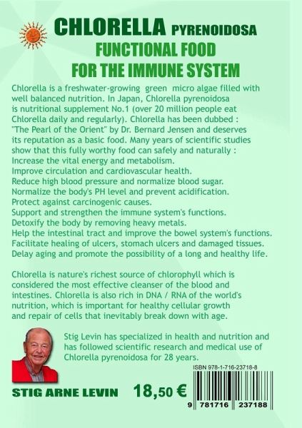 Chlorella is a freshwater-growing green micro algae filled with well balanced nutrition. In Japan, Chlorella pyrenoidosa is nutritional supplement No.1 (over 20 million people eat Chlorella daily and regularly). Chlorella has been dubbed : "The Pearl of the Orient" by Dr. Bernard Jensen and deserves its reputation as a basic food. Many years of scientific studies show that this fully worthy food can safely and naturally : Increase the vital energy and metabolism. Improve circulation and cardiovascular health. Reduce high blood pressure and normalize blood sugar. Normalize the body's PH level and prevent acidification. Protect against carcinogenic causes. Support and strengthen the immune system's functions. Detoxify the body by removing heavy metals. Help the intestinal tract and improve the bowel system's functions. Facilitate healing of ulcers, stomach ulcers and damaged tissues. Delay aging and promote the possibility of a long and healthy life. Chlorella is nature's richest source of chlorophyll which is considered the most effective cleanser of the blood and intestines. Chlorella is also rich in DNA / RNA of the world's nutrition, which is important for healthy cellular growth and repair of cells that inevitably break down with age. Stig Levin has specialized in health and nutrition and has followed scientific research and medical use of Chlorella pyrenoidosa for 28 years.