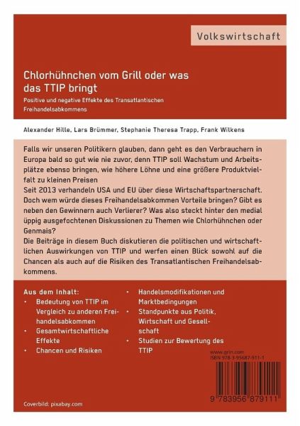 Fachbuch aus dem Jahr 2015 im Fachbereich VWL - Internationale Wirtschaftsbeziehungen, , Sprache: Deutsch, Abstract: Falls wir unseren Politikern glauben, dann geht es den Verbrauchern in Europa bald so gut wie nie zuvor, denn TTIP soll Wachstum und Arbeitsplätze ebenso bringen, wie höhere Löhne und eine größere Produktvielfalt zu kleinen Preisen.Seit 2013 verhandeln USA und EU über diese Wirtschaftspartnerschaft. Doch wem würde dieses Freihandelsabkommen Vorteile bringen? Gibt es neben den Gewinnern auch Verlierer? Was also steckt hinter den medial üppig ausgefochtenen Diskussionen zu Themen wie Chlorhühnchen oder Genmais?Die Beiträge in diesem Buch diskutieren die politischen und wirtschaftlichen Auswirkungen von TTIP und werfen einen Blick sowohl auf die Chancen als auch auf die Risiken des Transatlantischen Freihandelsabkommens.Aus dem Inhalt:Bedeutung von TTIP im Vergleich zu anderen FreihandelsabkommenGesamtwirtschaftliche EffekteChancen und RisikenHandelsmodifikationen undMarktbedingungenStandpunkte aus Politik, Wirtschaft und GesellschaftStudien zur Bewertung des TTIP