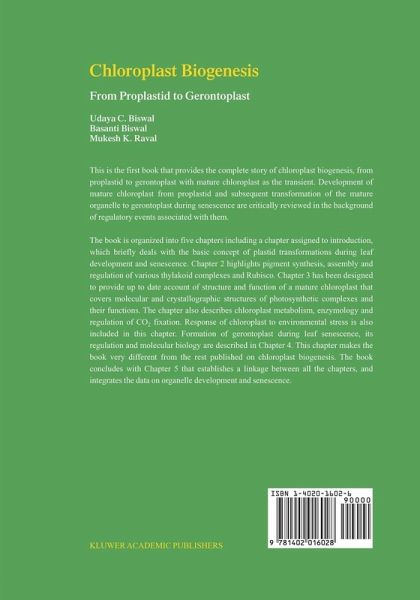 Chloroplast is the organelle where the life-giving process photosynthesis takes place; it is the site where plants and algae produce food and oxygen that sustain our life. The story of how it originates from proplastids, and how it ultimately dies is beautifully portrayed by three authorities in the field: Basanti Biswal, Udaya Biswal and M. K. Raval. I consider it a great privilege and honor to have been asked to write this foreword. The book ' Chloroplast biogenesis: from proplastid to gerontoplast' goes much beyond photosynthesis. The character of the book is different from that of many currently available books because it provides an integrated approach to cover the entire life span of the organelle including its senescence and death. The books available are mostly confined to the topics relating to the 'build up' or development of chloroplast during greening. The story of organelle biogenesis without description of the events associated with its regulated dismantling during genetically programmed senescence is incomplete. A large volume of literature is available in this area of chloroplast senescence accumulated during the last 20 years. Although some of the findings in this field have been organized in the form of reviews, the data in the book are generalized and integrated with simple text and graphics. This book describes the structural features of prop las tid and its transformation to fully mature chloroplast, which is subsequently transformed into gerontoplast exhibiting senescence syndrome. The book consists of five major chapters.