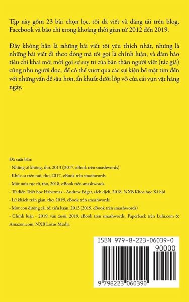 T¿p này g¿m 23 bài ch¿n l¿c, tôi ¿ã vi¿t và ¿¿ng t¿i trên blog, Facebook và báo chí trong khöng th¿i gian t¿ 2012 ¿¿n 2019. ¿ây không h¿n là nh¿ng bài vi¿t tôi yêu thích nh¿t, nh¿ng là nh¿ng bài vi¿t ¿i theo dòng mà tôi g¿i là chính lün, và ¿¿m b¿o tiêu chí khai m¿, m¿i g¿i s¿ suy t¿ c¿a b¿n thân ng¿¿i vi¿t (tác gi¿) c¿ng nh¿ ng¿¿i ¿¿c, ¿¿ có th¿ v¿¿t qua các s¿ ki¿n b¿ m¿t tìm ¿¿n v¿i nh¿ng v¿n ¿¿ sâu h¿n, ¿n khüt d¿¿i l¿p v¿ c¿a cái v¿n v¿t hàng ngày.