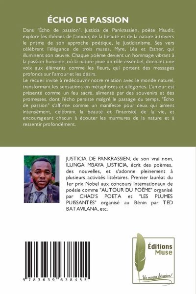 Dans "Écho de passion", Justicia de Pankrassien, poète Maudit, explore les thèmes de l'amour, de la beauté et de la nature à travers le prisme de son approche poétique, le Justicianisme. Ses vers célèbrent l'élégance de trois muses, Myre, Léa et Esther, qui illuminent son oeuvre. Chaque poème devient un hommage vibrant à la passion humaine, où la nature joue un rôle essentiel, donnant une voix aux éléments comme les fleurs, qui portent des messages profonds sur l'amour et les désirs.Le recueil invite à redécouvrir notre relation avec le monde naturel, transformant les sensations en métaphores et allégories. L'amour est présenté comme un feu sacré, alimenté par des souvenirs et des promesses, dont l'écho persiste malgré le passage du temps. "Écho de passion" s'affirme comme un manifeste pour ceux qui aiment intensément, célébrant la beauté et l'intensité de la vie, et encourageant chacun à écouter les murmures de la nature et à ressentir profondément.