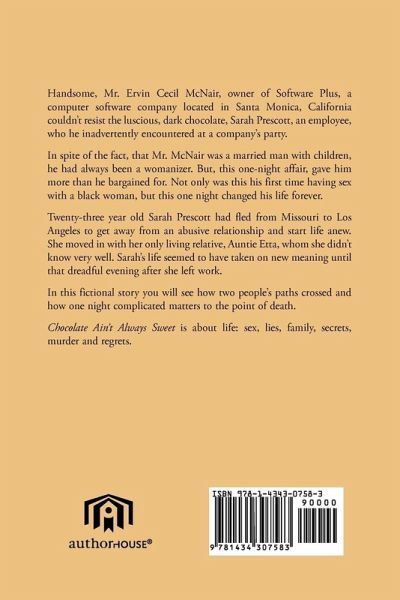 Handsome, Mr. Ervin Cecil McNair, owner of Software Plus, a computer software company located in Santa Monica, California couldn't resist the luscious, dark chocolate, Sarah Prescott, an employee, who he inadvertently encountered at a company's party. In spite of the fact, that Mr. McNair was a married man with children, he had always been a womanizer. But, this one-night affair, gave him more than he bargained for. Not only was this his first time having sex with a black woman, but this one night changed his life forever. Twenty-three year old Sarah Prescott had fled from Missouri to Los Angeles to get away from an abusive relationship and start life anew. She moved in with her only living relative, Auntie Etta, who she didn't know very well. Sarah's life seemed to have taken on new meaning until that dreadful evening after she left work. In this fictional story you will see how two people paths crossed and how one night complicated matters to the point of death. Chocolate Ain't Always Sweet is about life: sex, lies, family, secrets, murder and regrets.