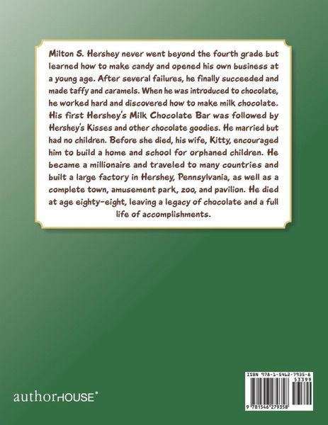Milton S. Hershey never went beyond the fourth grade but learned how to make candy and opened his own business at a young age. After several failures, he finally succeeded and made taffy and caramels. When he was introduced to chocolate, he worked hard and discovered how to make milk chocolate. His first Hershey's Milk Chocolate Bar was followed by Hershey's Kisses and other chocolate goodies. He married but had no children. Before she died, his wife, Kitty, encouraged him to build a home and school for orphaned children. He became a millionaire and traveled to many countries and built a large factory in Hershey, Pennsylvania, as well as a complete town, amusement park, zoo, and pavilion. He died at age eighty-eight, leaving a legacy of chocolate and a full life of accomplishments.