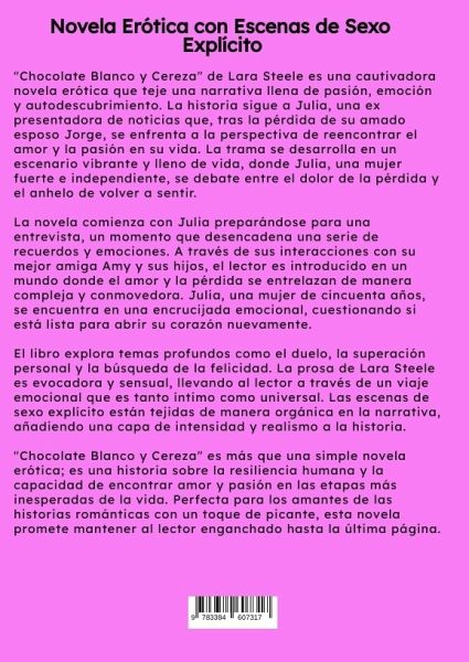 "Chocolate Blanco y Cereza" de Lara Steele es una cautivadora novela erótica que teje una narrativa llena de pasión, emoción y autodescubrimiento. La historia sigue a Julia, una ex presentadora de noticias que, tras la pérdida de su amado esposo Jorge, se enfrenta a la perspectiva de reencontrar el amor y la pasión en su vida. La trama se desarrolla en un escenario vibrante y lleno de vida, donde Julia, una mujer fuerte e independiente, se debate entre el dolor de la pérdida y el anhelo de volver a sentir.La novela comienza con Julia preparándose para una entrevista, un momento que desencadena una serie de recuerdos y emociones. A través de sus interacciones con su mejor amiga Amy y sus hijos, el lector es introducido en un mundo donde el amor y la pérdida se entrelazan de manera compleja y conmovedora. Julia, una mujer de cincuenta años, se encuentra en una encrucijada emocional, cuestionando si está lista para abrir su corazón nuevamente.El libro explora temas profundos como elduelo, la superación personal y la búsqueda de la felicidad. La prosa de Lara Steele es evocadora y sensual, llevando al lector a través de un viaje emocional que es tanto íntimo como universal. Las escenas de sexo explícito están tejidas de manera orgánica en la narrativa, añadiendo una capa de intensidad y realismo a la historia."Chocolate Blanco y Cereza" es más que una simple novela erótica; es una historia sobre la resiliencia humana y la capacidad de encontrar amor y pasión en las etapas más inesperadas de la vida. Perfecta para los amantes de las historias románticas con un toque de picante, esta novela promete mantener al lector enganchado hasta la última página.