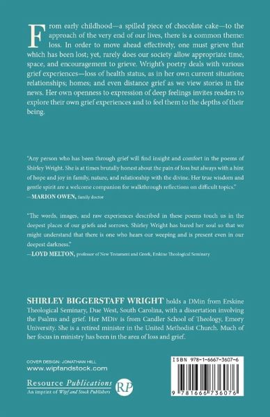 From early childhood--a spilled piece of chocolate cake--to the approach of the very end of our lives, there is a common theme: loss. In order to move ahead effectively, one must grieve that which has been lost; yet, rarely does our society allow appropriate time, space, and encouragement to grieve. Wright's poetry deals with various grief experiences--loss of health status, as in her own current situation; relationships; homes; and even distance grief as we view stories in the news. Her own openness to expression of deep feelings invites readers to explore their own grief experiences and to feel them to the depths of their being.