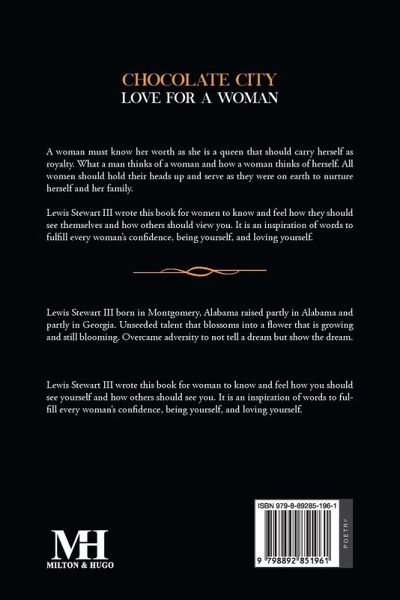 A woman must know her worth as she is a queen that should carry herself as royalty. What a man thinks of a woman and how a woman thinks of herself. All women should hold their heads up and serve as they were on earth to nurture herself and her family. Lewis Stewart III wrote this book for women to know and feel how they should see themselves and how others should view you. It is an inspiration of words to fulfill every woman's confidence, being yourself, and loving yourself.