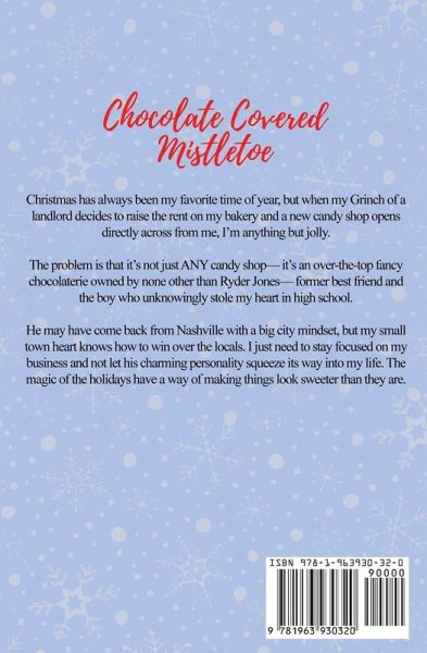 Christmas has always been my favorite time of year, but when my Grinch of a landlord decides to raise the rent on my bakery and a new candy shop opens directly across from me, I'm anything but jolly. The problem is that it's not just ANY candy shop- it's an over-the-top fancy chocolaterie owned by none other than Ryder Jones- former best friend and the boy who unknowingly stole my heart in high school. He may have come back from Nashville with a big city mindset, but my small town heart knows how to win over the locals. I just need to stay focused on my business and not let his charming personality squeeze its way into my life. The magic of the holidays have a way of making things look sweeter than they are.