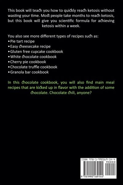 This book will teach you how to quickly reach ketosis without wasting your time. Most people take months to reach ketosis, but this book will give you scientific formula for achieving ketosis within a week. You also see more different types of recipes such as: Pie tart recipe Easy cheesecake recipe Gluten free cupcake cookbook White chocolate cookbook Cherry pie cookbook Chocolate truffle cookbook Granola bar cookbook In this chocolate cookbook, you will also find main meal recipes that are kicked up in flavor with the addition of some chocolate. Chocolate chili, anyone?