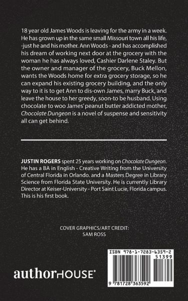 18 year old James Woods is leaving for the army in a week. He has grown up in the same small Missouri town all his life, -just he and his mother. Ann Woods - and has accomplished his dream of working next door at the grocery with the woman he has always loved, Cashier Darlene Staley. But the owner and manager of the grocery, Buck Mellon, wants the Woods home for extra grocery storage, so he can expand his existing grocery building, and the only way to it is to get Ann to dis-own James, marry Buck, and leave the house to her greedy, soon-to be husband. Using chocolate to woo James' peanut butter addicted mother, Chocolate Dungeon is a novel of suspense and sensitivity all can get behind.