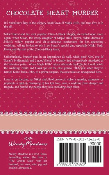 It's Valentine's Day in the wintery small town of Maple Hills, and true love is in the air. Nikki Bates and her ever popular Choc-A-Block Shoppe are called upon once again, when Susan, the lovely daughter of Maple Hills' mayor, orders dozens of Nikki's wildly popular and oh-so-delicious confections for her upcoming wedding. All are invited to join in on Susan's special day, especially Nikki, Seth, Hawk and the rest of the Choc-A-Block team. Unfortunately, murder puts in an appearance as well, when poor Kim, one of Susan's bridesmaids and a good friend, is brutally and mysteriously murdered at the rehearsal party. When Maple Hills' mayor demands the killer be found before the wedding, Nikki and Hawk get on the case pronto. But, just when they've named Kim's beau, John, as a prime suspect, the case takes an unexpected turn. Love is on the line, as Nikki and Hawk move to solve a murder, exonerate or implicate a man in mourning of his lost love, save a wedding from danger and tragedy, and protect the people they love-including each other. This cozy mystery is a clean read: no graphic violence, sex, or strong language. It can be read in one to two hours. It is perfect for those moments when you are waiting at an appointment or want to enjoy a quick read.