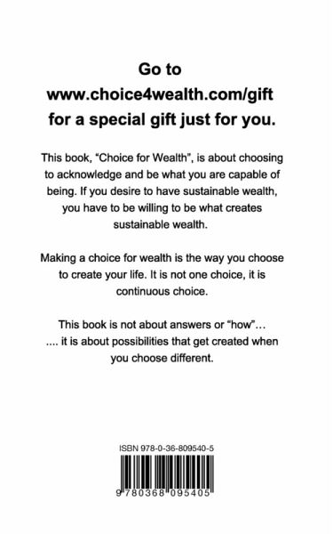 This book is about choosing to acknowledge and be what you are capable of being. If you desire to have sustainable wealth, you have to be what creates sustainable wealth. Making a choice for wealth is the way you choose to create your life. It is not one choice, it is continuous choice. This book is not about answers or "how" - it is about possibilities that get created when you choose different.