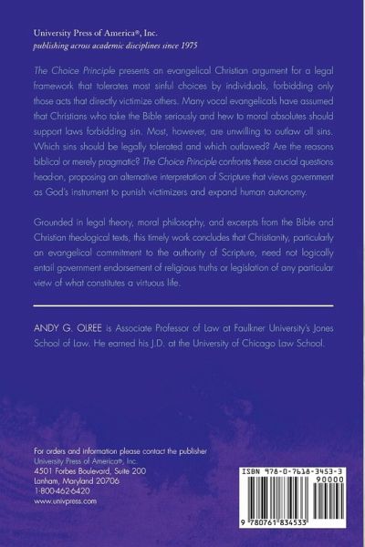 The Choice Principle presents an evangelical Christian argument for a legal framework that tolerates most sinful choices by individuals, forbidding only those acts that directly victimize others. Many vocal evangelicals have assumed that Christians who take the Bible seriously and hew to moral absolutes should support laws forbidding sin. Most, however, are unwilling to outlaw all sins. Which sins should be legally tolerated and which outlawed? Are the reasons biblical or merely pragmatic? The Choice Principle confronts these crucial questions head-on, proposing an alternative interpretation of Scripture that views government as God's instrument to punish victimizers and expand human autonomy. Grounded in legal theory, moral philosophy, and excerpts from the Bible and Christian theological texts, this timely work concludes that Christianity, particularly an evangelical commitment to the authority of Scripture, need not logically entail government endorsement of religious truths or legislation of any particular view of what constitutes a virtuous life.