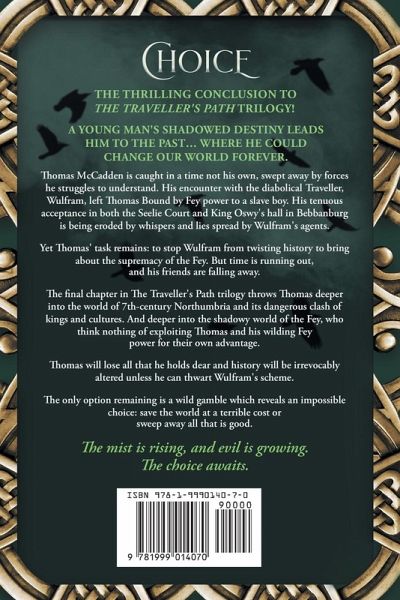 The thrilling conclusion to The Traveller's Path - a historical fantasy trilogy set in Dark Ages England! A young man's shadowed destiny leads him to the past... where he could change our world forever. Thomas McCadden is caught in a time not his own, swept away by forces he struggles to understand. HIs encounter with the diabolical Traveller, Wulfram, left Thomas Bound by Fey power to a slave boy. His tenuous acceptance in both the Seelie Court and King Oswy's hall in Bebbanburg is being eroded by whispers and lies spread by Wulfram's agents. Yet Thomas' task remains: to stop Wulfram from twisting history to bring about the supremacy of the Fey. But time is running out, and his friends are falling away. The final chapter in The Traveller's Path historical fantasy trilogy throws Thomas deeper into the world of 7th-century Northumbria and its dangerous clash of kings and cultures. And deeper into the shadowy world of the Fey, who think nothing of exploiting Thomas and his wilding Fey power for their own advantage. Thomas will lose all that he holds dear and history will be irrevocably altered unless he can thwart Wulfram's scheme. The only option remaining is a wild gamble which reveals an impossible choice: save the world at a terrible cost or sweep away all that is good. The mist is rising, and evil is growing. The choice awaits.
