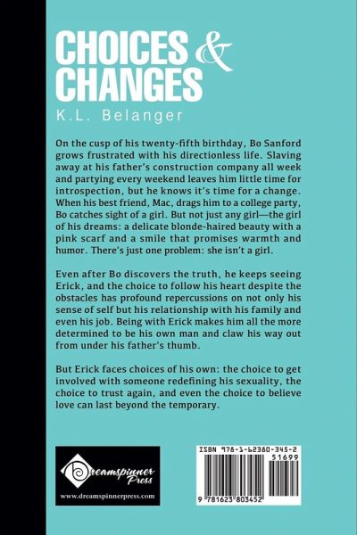 On the cusp of his twenty-fifth birthday, Bo Sanford grows frustrated with his directionless life. Slaving away at his father's construction company all week and partying every weekend leaves him little time for introspection, but he knows it's time for a change. When his best friend, Mac, drags him to a college party, Bo catches sight of a girl. But not just any girl-the girl of his dreams: a delicate blonde-haired beauty with a pink scarf and a smile that promises warmth and humor. There's just one problem: she isn't a girl. Even after Bo discovers the truth, he keeps seeing Erick, and the choice to follow his heart despite the obstacles has profound repercussions on not only his sense of self but his relationship with his family and even his job. Being with Erick makes him all the more determined to be his own man and claw his way out from under his father's thumb. But Erick faces choices of his own: the choice to get involved with someone redefining his sexuality, the choice to trust again, and even the choice to believe love can last beyond the temporary.