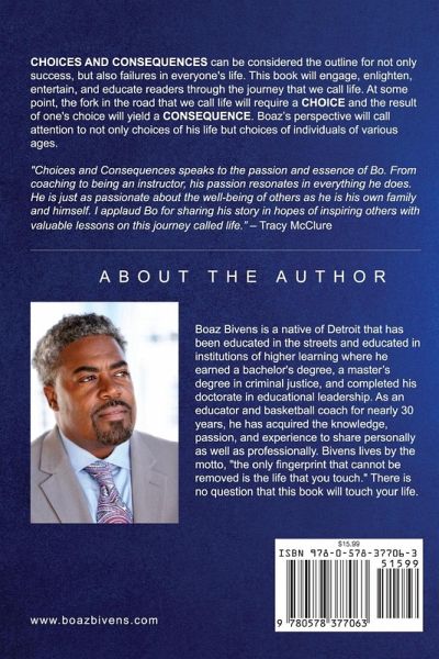 The pages of my debut autobiography Choices and Consequences are inspired by the events of my life. I wrote this book to enlighten, inform and empower others to be keenly aware of their daily choices. Dealing with consequences allows us to navigate through our daily lives and paint a picture of how we do or do not want our lives to appear. However, we all know individuals who want to paint our picture for us or give their interpretation of us as if it were gospel. All of us have enough going on in our personal lives that we must each direct our attention to the Brush and Canvas of our own portrait. Regardless of what others think, say, or believe, every individual must make his or her own CHOICES and reap the resulting CONSEQUENCES. As the sun rises each day, we all have CHOICES to make. By the time the sun sets, we sometimes face the CONSEQUENCES for each one of our CHOICES. There is no question that God is the "Ultimate Decision Maker" and "Consequence Giver", but He allows us to navigate through our daily lives and paint a picture of what we want our lives to look like, or how they should not look.