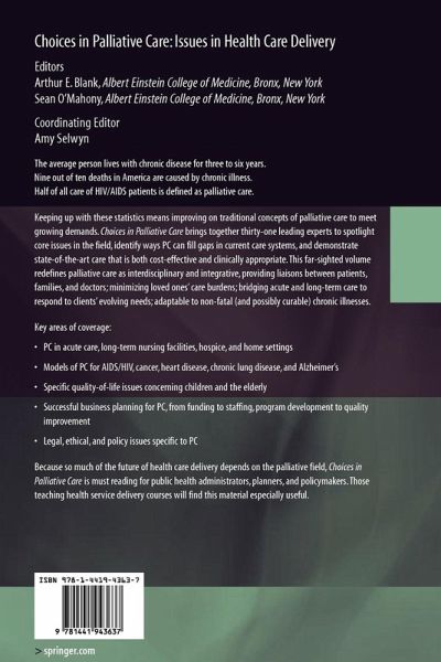 Choices in Palliative Care will address the need for more information on the management of palliative care programs. Part I addresses the various settings where palliative care occurs, Part II addresses the specific disease management approach and quality of life care including cancer, heart disease, dementia and AIDS/HIV. Part III addresses specific issues in palliative care by population including minorities, the elderly, and children. While Part IV will address broader professional issues including developing a business plan for a palliative care program; legal and ethical issues around end-of-life care; quality management; and policy issues.