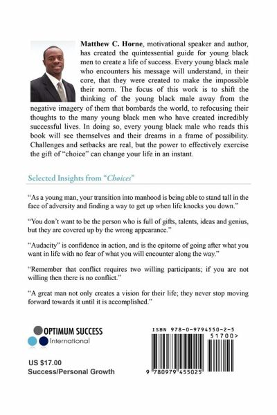 Choices: The Young black Man's Guide to Successful Living is a guide to for young black male's to show them how to not fall prey to society's opinion of them, rather to push the boundaries of what's possible for their life. After reading Choices, every young black male will develop a vision for their life, and view it in a light of possibility.