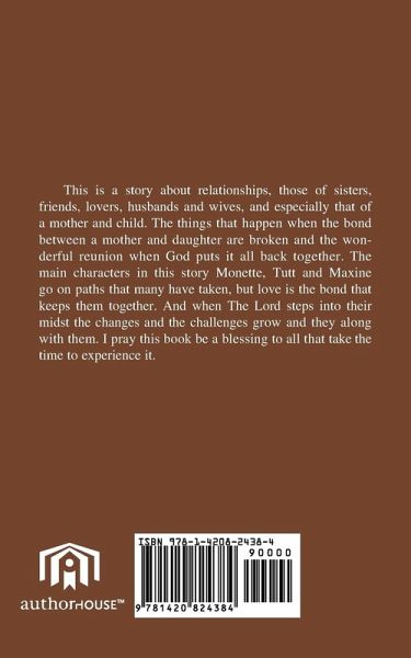 This is a story about relationships, those of sisters, friends, lovers, husbands and wives, and especially that of a mother and child. The things that happen when the bond between a mother and daughter are broken and the wonderful reunion when God puts it all back together. The main characters in this story Monette, Tutt and Maxine go on paths that many have taken, but love is the bond that keeps them together. And when The Lord steps into their midst the changes and the challenges grow and they along with them. I pray this book be a blessing to all that take the time to experience it.