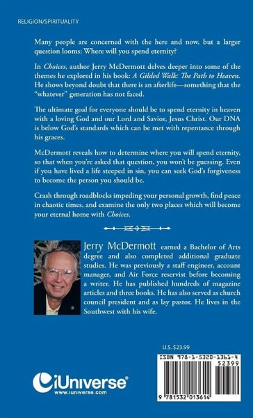 Many people are concerned with the here and now, but a larger question looms: Where will you spend eternity? In Choices, author Jerry McDermott delves deeper into some of the themes he explored in his book: A Gilded Walk: The Path to Heaven. He shows beyond doubt that there is an afterlife-something that the "whatever" generation has not faced. The ultimate goal for everyone should be to spend eternity in heaven with a loving God and our Lord and Savior, Jesus Christ. Our DNA is below God's standards which can be met with repentance through his graces. McDermott reveals how to determine where you will spend eternity, so that when you're asked that question, you won't be guessing. Even if you have lived a life steeped in sin, you can seek God's forgiveness to become the person you should be. Crash through roadblocks impeding your personal growth, find peace in chaotic times, and examine the only two places which will become your eternal home with Choices.