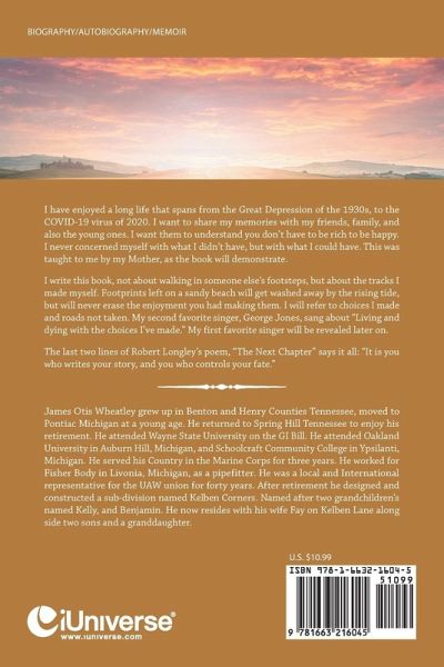 I have enjoyed a long life that spans from the Great Depression of the 1930s, to the COVID-19 virus of 2020. I want to share my memories with my friends, family, and also the young ones. I want them to understand you don't have to be rich to be happy. I never concerned myself with what I didn't have, but with what I could have. This was taught to me by my Mother, as the book will demonstrate. I write this book, not about walking in someone else's footsteps, but about the tracks I made myself. Footprints left on a sandy beach will get washed away by the rising tide, but will never erase the enjoyment you had making them. I will refer to choices I made and roads not taken. My second favorite singer, George Jones, sang about "Living and dying with the choices I've made." My first favorite singer will be revealed later on. The last two lines of Robert Longley's poem, "The Next Chapter" says it all: "It is you who writes your story, and you who controls your fate."
