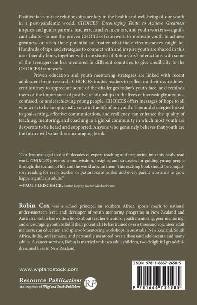 Positive face-to-face relationships are key to the health and well-being of our youth in a post-pandemic world. CHOICES: Encouraging Youth to Achieve Greatness inspires and guides parents, teachers, coaches, mentors, and youth workers--significant adults--to use the proven CHOICES framework to motivate youth to achieve greatness or reach their potential no matter what their circumstances might be. Hundreds of tips and strategies to connect with and inspire youth are shared in this user-friendly book, together with true stories of Robin Cox's interactions with some of the teenagers he has mentored in different countries to give credibility to the CHOICES framework. Proven education and youth mentoring strategies are linked with recent adolescent brain research. CHOICES invites readers to reflect on their own adolescent journey to appreciate some of the challenges today's youth face, and reminds them of the importance of positive relationships in the lives of increasingly anxious, confused, or underachieving young people. CHOICES offers messages of hope to all who wish to be an optimistic voice in the life of our youth. Tips and strategies linked to goal-setting, effective communication, and resiliency can enhance the quality of teaching, mentoring, and coaching in a global community in which most youth are desperate to be heard and supported. Anyone who genuinely believes that youth are the future will value this encouraging book.