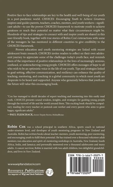 Positive face-to-face relationships are key to the health and well-being of our youth in a post-pandemic world. CHOICES: Encouraging Youth to Achieve Greatness inspires and guides parents, teachers, coaches, mentors, and youth workers--significant adults--to use the proven CHOICES framework to motivate youth to achieve greatness or reach their potential no matter what their circumstances might be. Hundreds of tips and strategies to connect with and inspire youth are shared in this user-friendly book, together with true stories of Robin Cox's interactions with some of the teenagers he has mentored in different countries to give credibility to the CHOICES framework. Proven education and youth mentoring strategies are linked with recent adolescent brain research. CHOICES invites readers to reflect on their own adolescent journey to appreciate some of the challenges today's youth face, and reminds them of the importance of positive relationships in the lives of increasingly anxious, confused, or underachieving young people. CHOICES offers messages of hope to all who wish to be an optimistic voice in the life of our youth. Tips and strategies linked to goal-setting, effective communication, and resiliency can enhance the quality of teaching, mentoring, and coaching in a global community in which most youth are desperate to be heard and supported. Anyone who genuinely believes that youth are the future will value this encouraging book.