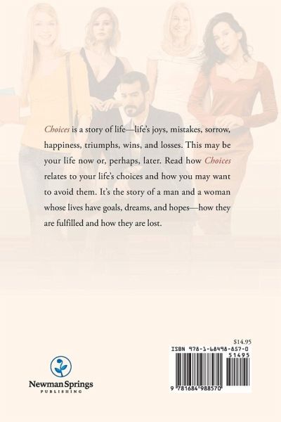 Choices is a story of life--life's joys, mistakes, sorrow, happiness, triumphs, wins, and losses. This may be your life now or, perhaps, later. Read how Choices relates to your life's choices and how you may want to avoid them. It's the story of a man and a woman whose lives have goals, dreams, and hopes--how they are fulfilled and how they are lost.