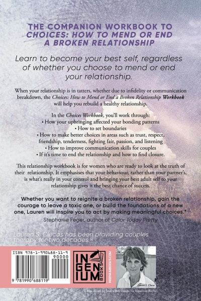 Learn to become your best self, regardless of whether you choose to mend or end your relationship. When your relationship is in tatters, whether due to infidelity or poor communication skills for couples, the Choices: How to Mend or End a Broken Relationship Workbook will help you foster a good relationship with yourself first, which is the bedrock for every healthy relationship. In the Choices Workbook, learn about: How your upbringing affected your bonding patterns How to keep the relationship safe and establish boundaries How to up your game in the key choices such as trust, respect, friendship, tenderness, fighting fair, passion, and listening. How to decide if it's time to end the relationship, and if you do, how to find closure. This relationship workbook is for women who are ready to look at the truth of their relationship. It emphasises that your behaviour, rather than your partner's, is what's really in your control and bringing your best adult self to your relationship gives it the best chance of success. The companion workbook to Choices: How to Mend or End a Broken Relationship
