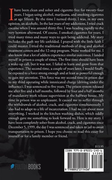 I have been clean and sober and cigarette-free for twenty-four years. I began using alcohol, marijuana, and smoking cigarettes at age fifteen. By the time I turned thirty, I was, in my own opinion, an alcoholic. In the last years of my addictions, I tried crack cocaine when I was around thirty-five. I was heading rapidly to the very bottom afterward. Of course, I smoked cigarettes for years. I tried many times and many ways to quit being addicted. My story includes the path my life unfolded. I prayed with the little faith I could muster. I tried the traditional methods of drug and alcohol treatment centers and the 12-step program. None worked for me. I also know that a lot of addicts experience similar outcomes. I landed myself in prison a couple of times. The first time should have been a wake-up call, but it was not. I failed to learn and grow from that experience. The second time, a couple of years later, I would finally be exposed to a force strong enough and at least as powerful enough to gain my attention. This force was my second time in prison due to my third operating while intoxicated charge (driving under the influence). I was sentenced to five years. The prison system released me after five and a half months, followed by four and a half months of mandatory work release supervision at the halfway house. My time in prison was so unpleasant. It caused me to suffer through the withdrawals of alcohol, crack, and cigarettes simultaneously. I also had to adapt to a life of incarceration. I had no say about most everything. I worked in the kitchen washing dishes, which oddly enough gave me something to look forward to. Here is my story. I have been completely sober from alcohol, crack, and cigarettes since December 5, 1999, the day I was sentenced and taken to jail to await transportation to prison. I hope you choose to read this essay for yourself or for a family member or friend.