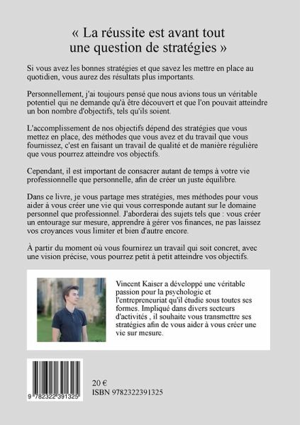 "La réussite est avant tout une question de stratégies".Si vous avez les bonnes stratégies et que savez les mettre en place au quotidien, vous aurez des résultats plus importants.Personnellement, j'ai toujours pensé que nous avions tous un véritable potentiel qui ne demande qu'à être découvert et que l'on pouvait atteindre un bon nombre d'objectifs, tels qu'ils soient.L'accomplissement de nos objectifs dépend des stratégies que vous mettez en place, des méthodes que vous avez et du travail que vous fournissez, c'est en faisant un travail de qualité et de manière régulière que vous pourrez atteindre vos objectifs.Cependant, il est important de consacrer autant de temps à votre vie professionnelle que personnelle, afin de créer un juste équilibre.Dans ce livre, je vous partage mes stratégies, mes méthodes pour vous aider à vous créer une vie qui vous corresponde autant sur le domaine personnel que professionnel.J'aborderai des sujets tels que : vous créer un entourage sur mesure, apprendre à gérer vos finances, ne pas laissez vos croyances vous limiter et bien d'autres encore.À partir du moment où vous fournirez un travail qui soit concret, avec une vision précise, vous pourrez petit à petit atteindre vos objectifs.