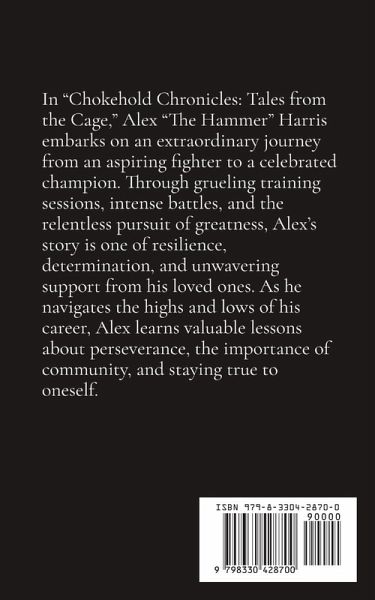 Chokehold Chronicles: Tales from the Cage follows the gripping journey of Alex "The Hammer" Harris, a determined fighter navigating the intense world of mixed martial arts. From his humble beginnings at Iron Fist Gym to his rise as a champion, Alex faces relentless challenges, fierce rivalries, and moments of self-doubt. Guided by his mentors, Marcus and Mike, and supported by his friends and family, Alex learns the true meaning of resilience, perseverance, and the power of community. As he battles formidable opponents like Jake "The Beast" Thompson, Alex's journey is a testament to the strength of the human spirit and the pursuit of dreams. This compelling tale of grit, growth, and redemption will inspire readers to overcome their own obstacles and strive for greatness.