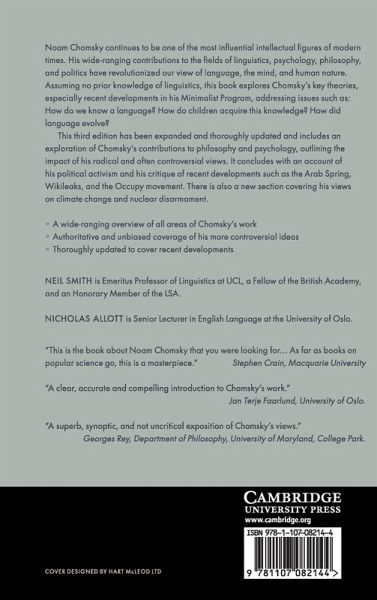 Noam Chomsky continues to be one of the most influential intellectual figures of modern times. His wide-ranging contributions to the fields of linguistics, psychology, philosophy and politics have revolutionised our view of language, the mind and human nature. Assuming no prior knowledge of linguistics, this book explores Chomsky's key theories, especially recent developments in his Minimalist Program, addressing issues such as: how do we know a language? How do children acquire this knowledge? How did language evolve? This third edition has been expanded and thoroughly updated and includes an exploration of Chomsky's contributions to philosophy and psychology, outlining the impact of his radical and often controversial views. It concludes with an account of his political activism and his critique of recent developments such as the Arab Spring, Wikileaks and the Occupy movement. There is also a new section covering his views on climate change and nuclear disarmament.